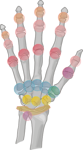 Target areas of the hands primarily involve the interphalangeal joints, especially