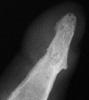 centrally. Fluffy bone periostitis and erosions at the interphalangeal joints