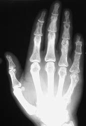 An abnormal trabecular lace-like pattern of destruction can often be seen at the phalanges and metacarpals of the hands. Cystic changes and osseous destructive lesions may also be evident. Acro-osteosclerosis with the radiographic appearance of terminal phlangeal sclerosis is not specific; however, it has been reported in up to half of the patients with skeletal abnormalities of sarcoidosis. Soft tissue swelling, and inflammatory skin nodules (erythema nodosum) are occasionally noted. If the wrist is involved, cystic changes and lytic lesions may be present.