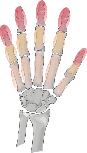 The hands are the most common site of osseous involvement. The middle and distal phalanges and less frequently the proximal phalanges and metatacarpals may show changes associated with sarcoidosis. Involvement at the wrist occurs much less frequently.