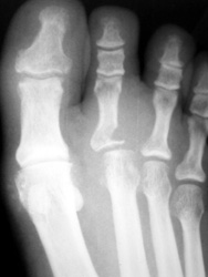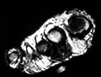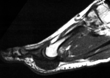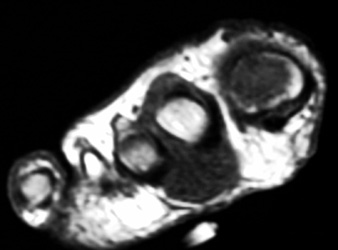 overhanging margins. 44years old male with rapidly enlarging mass in the foot. Radiographs demonstrates soft tissue mass between the 2nd and 3rd toes,with no calcification.Well defined erosion is noted at the radial aspect of the base of proximal phalanx of 2nd toe. Mild soft tissue swelling with faint calcification is also seen at 1st MTP joint ,with small erosion medial aspect of 1st Mt head. MR demonstrates mass is isointense to hypointense on T1W, and T2W images, with minimum bone marrow edema at the base of proximal phalanx of 2nd toe. Erosion is well seen at the base of proximal phalanx of 2nd toe on T1W images. |