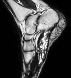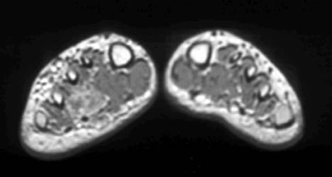 39 year old male with an extensive soft tissue mass involving the plantar aspect of the foot, dissecting between the third and fourth metatarsals, and extending into dorsum of the foot. The mass has intermediate signal on T1 and very high signal on T2 weighted images, and appears serpiginous. |