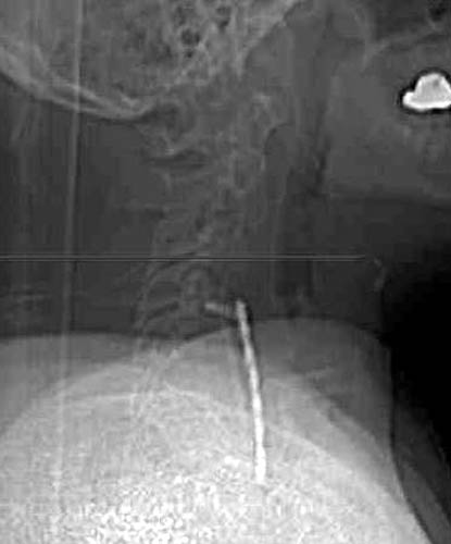 Scout image from a CT 3 month later suggests ventral displacement of the