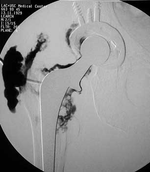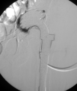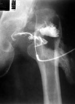 - Contrast aspirated and sent for cultures labeled hip wash.