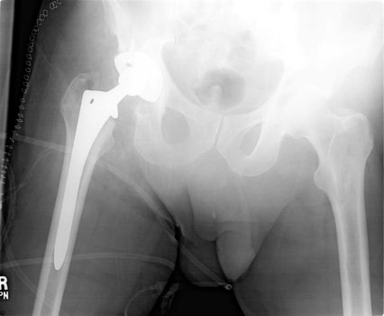 Immediate post operative radiographs after left bipolar hemiarthroplasty (A) and right total hip arthroplasty (B).