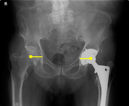 Distance from center of the femoral head to teardrop (or other identifiable