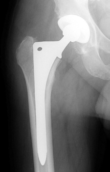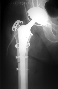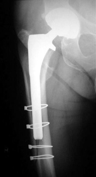 Control perforation lateral femoral cortex, reduced by cerclage cables. A control perforation of the lateral femoral cortex was performed in this revision total hip replacement to facilitate removal of the old femoral prosthesis. It is reduced by cerclage cables.