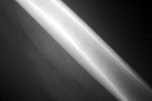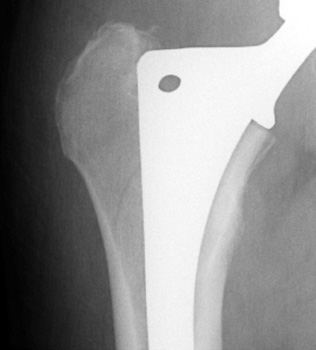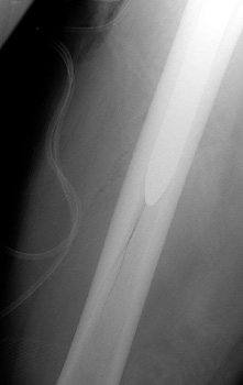 Vascular channel. Linear lucency seen on pre and post operative frog views is vascular channel. These are seen best on the frog leg view, entering the femoral cortex distally and traveling proximally toward the hip into the marrow space. |