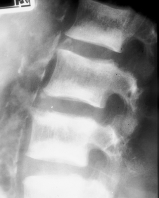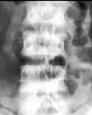 Diagnosis:Chronic renal failure Discussion:Roentgenographic appearance of increased density in the upper and lower zones of the vertebral body in a striated appearance. The pattern was similar to the alternating colors of the rugby players jersey design popular at the time of the description of this entity. Rugger Jersey spine is typically reserved for secondary hyperparathyroidism. References: