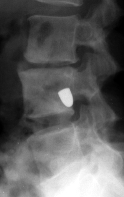 Diagnosis:Post traumatic bone cyst Discussion:Two sets of frontal and lateral radiographs, separated only by time, which reveal the "tumbling bullet sign"--which is simply a bullet which changes its location and orientation within a solitary bone cyst. This sign serves two purposes. It is documentation of the evolution of a solitary bone cyst as a corollary of trauma, and reveals the free movement of the foreign body within the confines of the lesion establishing its cystic rather than solid nature. It is similar to the fallen fragment sign. References: