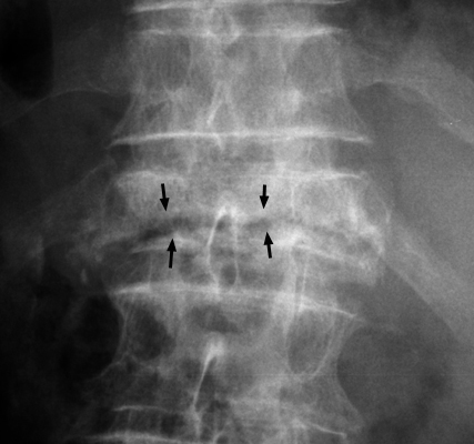 Diagnosis:Avascular Necrosis Discussion:Single frontal radiograph of the spine revealing a horizontally oriented linear area of lucency within the body of a single collapsed vertebral body. The intravertebral vacuum cleft sign is a gas-density cleft with a transverse separation of the vertebral body, appearing in extension and disappearing in flexion. It is secondary to local bony ischemic necrosis with nonhealing vertebral collapse. This ischemic vertebral fracture is not known to occur secondary to inflammation or neoplastic causes. References: