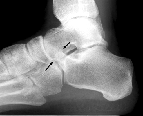 Diagnosis:Calcaneonavicular coalition Discussion:Plain film and CT images of calcaneonavicular coalition. Notice the elongated, tubular like extension of the anterior calcaneus seen on the lateral film; this imagery has been likened to the elongated nose of an anteater. There is abnormal bony fusion of the calcaneus and navicular bones, with the presence of a bony bar extending between these two bones. References: