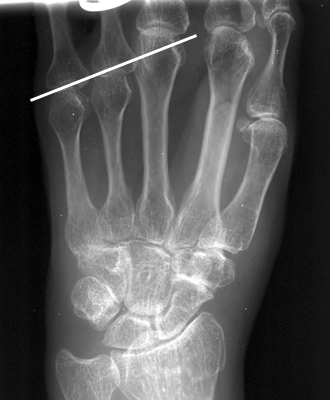 Diagnosis:Short 4th Metacarpal Discussion:Radiograph of the hand which reveals an abnormally short 4th metacarpal, as compared to the other metacarpal bones. Although this sign usually is associated with Turner's syndrome, the short 4th "metacarpal sign" carries a short differential diagnosis and is therefore not pathognomonic. References: