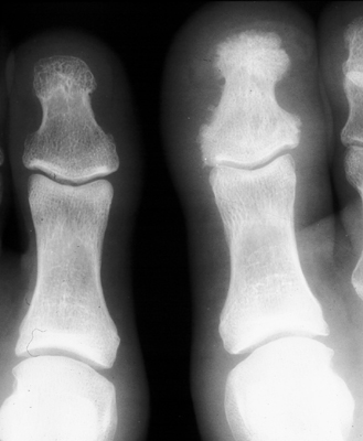Diagnosis:Psoriasis Discussion:Single x-ray of the toes revealing increased density throughout the osseous structures of the involved digit in a person with psoriatic arthritis. Sclerosis of an entire phalanx, typically the great toe, is likely the result of bony proliferation as an exaggerated healing response to injured bone in patients with seronegative spondyloarthropathy. References: